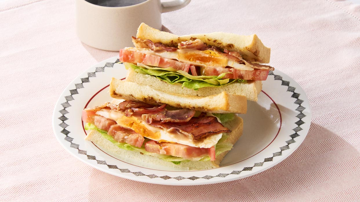 定番のベーコン、レタス、トマトに卵をプラスして、おいしく彩りよくボリュームアップ。