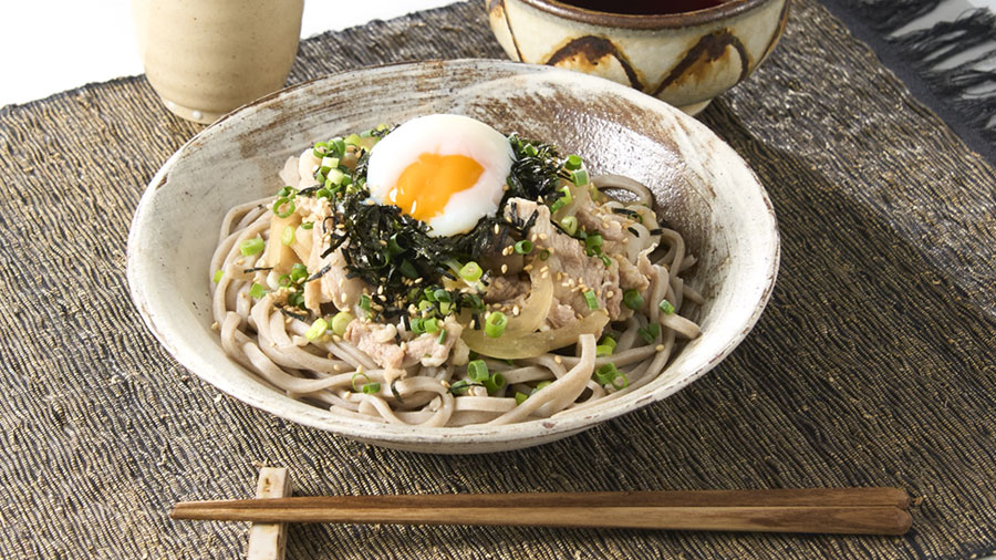 甘辛く煮た豚肉を、香り豊かなそばにたっぷりのせて。温泉卵のまろやかさも加わって、お箸が止まらない!