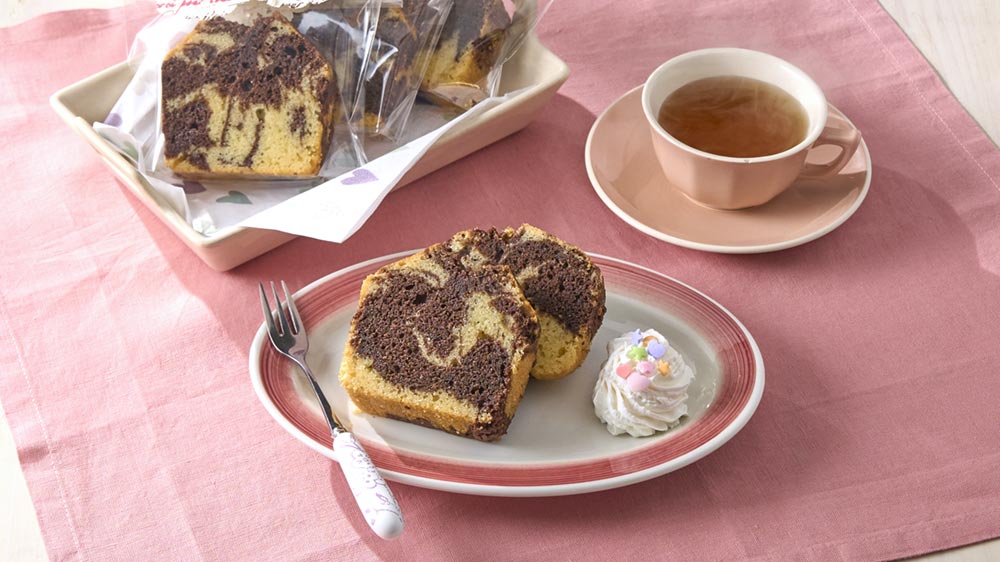 チョコとプレーン、ひとつで2種の味わい! 焼き上がった断面の模様も楽しみなマーブルケーキ。