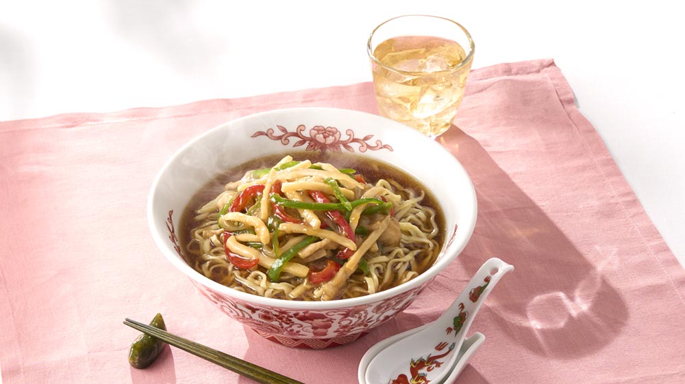 下ゆで、細切り、水切りが不要のBIO-RAL 国産有機野菜使用竹の子細切りを使って調理時間を短縮。青椒肉絲と合わせるラーメンは、あっさりとしたしょうゆラーメンがおすすめです。