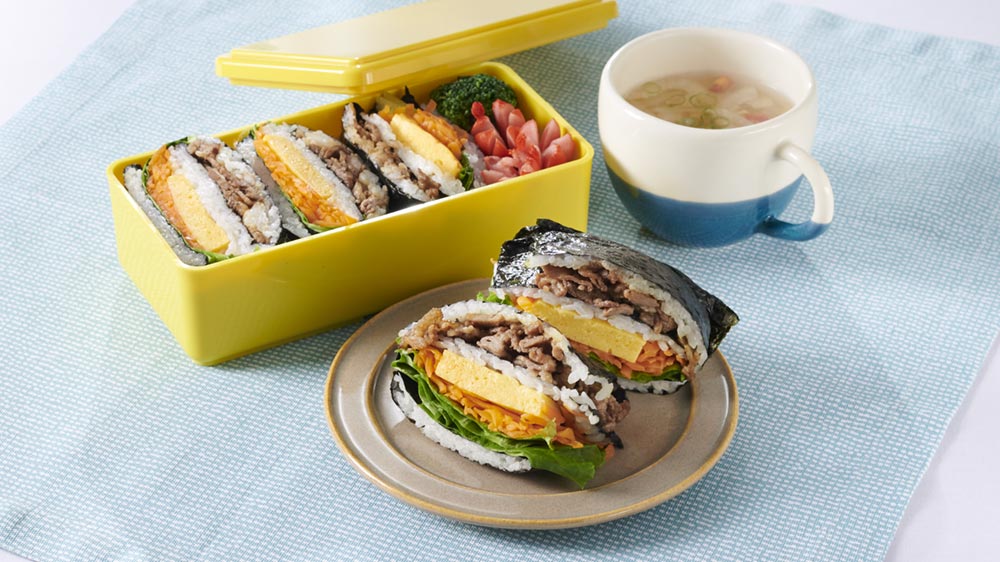 彩りよく具材を重ねて断面が鮮やか! ボリューム満点のにぎらない“おにぎらず”。