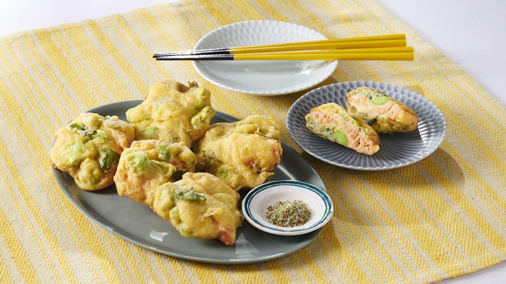 ホクホクのそら豆とふわふわの鮭のやさしい味わい。米粉を使った軽い食感のフリッター。